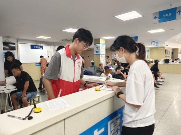活动当天,吕嘉涵同学提早来到医院投入到工作岗位中。在医院的导诊台区域,志愿者身穿醒目的红白色志愿服,为前来就诊的患者提供咨询服务,解答患者关于就诊流程、科室分布等疑问,协助患者填写各类就诊表格,有效缩短了患者的就诊时间。