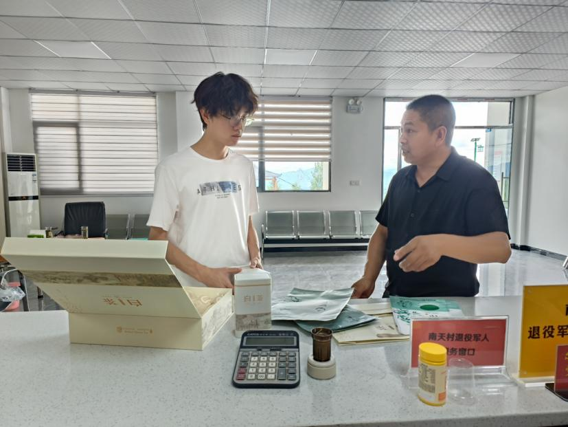 成员在村干部带领下,了解白茶成品的包装以及出售情况
