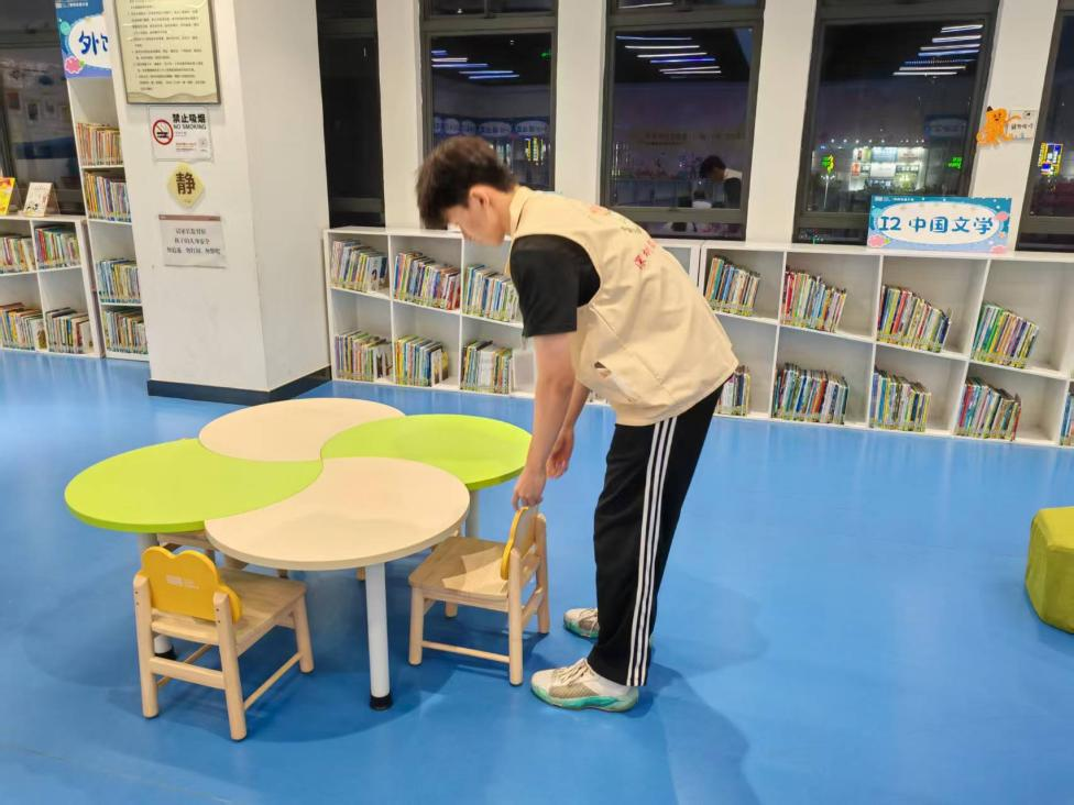 在新桥图书馆,实践团成员在工作人员的指导下,系统学习了图书分类法、书架整理规范、自助借还设备操作流程,明确了不同区域图书编码规则与归位要点。培训结束后,团队成员迅速投入到志愿工作中,将图书按类别归位、摆正歪斜的书籍,将椅子摆放整齐,优化了读者们的阅读体验。