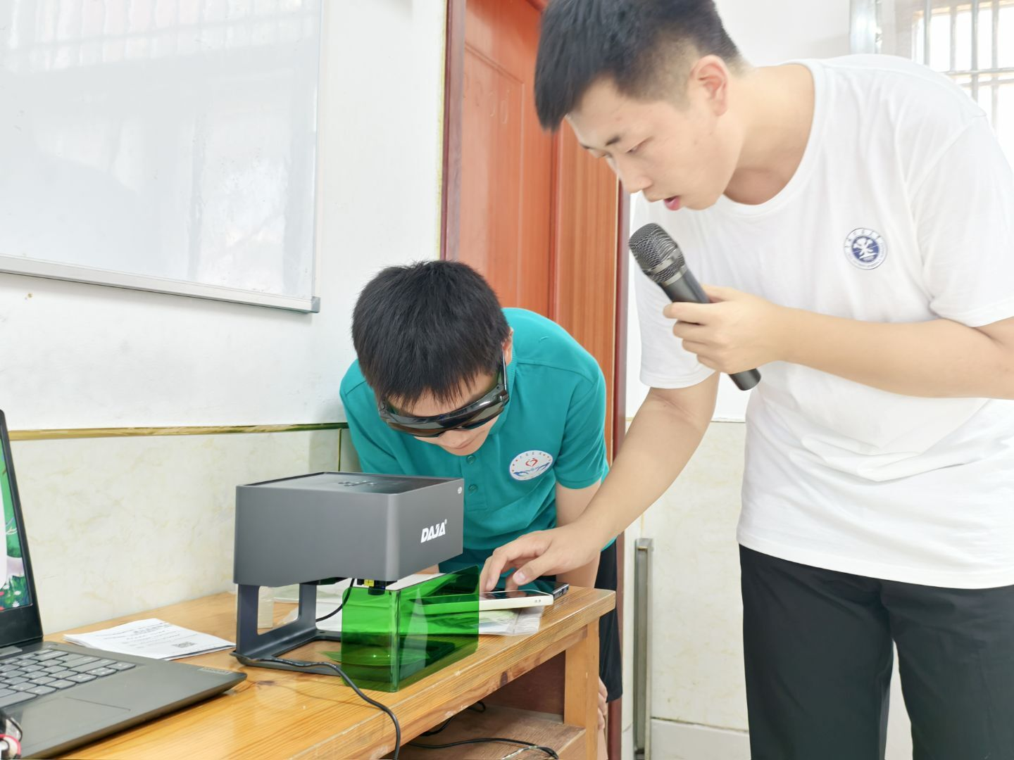 支教团首先带来《探索激光与智能的奥秘》实践课。支教老师借用机器人“小智”现场演示前进、转圈、空气质量检测等指令,把单片机、传感器等抽象概念转化为“大脑”“眼睛”,并借助放大镜聚焦阳光灼烧木片,直观展示激光能量集中原理,激发了学生探索科学的兴趣。《扎染与生活》课堂则将非遗蓝印花布引入教室,孩子们在支教老师指导下完成螺旋扎结、靛蓝浸染、氧化显色等工序,亲手制作出独一无二的手帕,感受传统工艺之美。