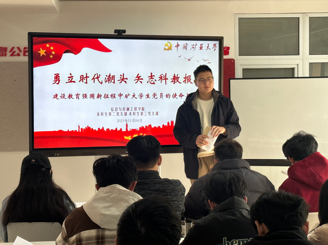 随后,学生党员代表黄耀漫、余淼依次重点分享。黄耀漫以“科教兴国战略下的青年担当”切入,强调青年党员不应仅做“成绩优异的学霸”,更要成“理想信念坚定的先锋模范”,主动将个人发展融入国家战略与教育强国建设;余淼结合全面发展理念分享感悟,呼吁党员深耕专业、锤炼本领,培养精神品格与理想信念,成长为能担当重任的栋梁之材。