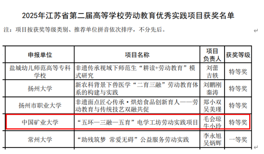 近日,江苏省高等教育学会公布了2025年江苏省第二届高等学校劳动教育优秀实践项目评选结果(苏高教会(2025)28号),学校推荐的5项实践项目全部获奖,其中特等奖1项、一等奖1项、二等奖3项。凯发娱乐