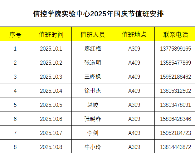 凯发娱乐 实验中心2025年国庆节值班安排